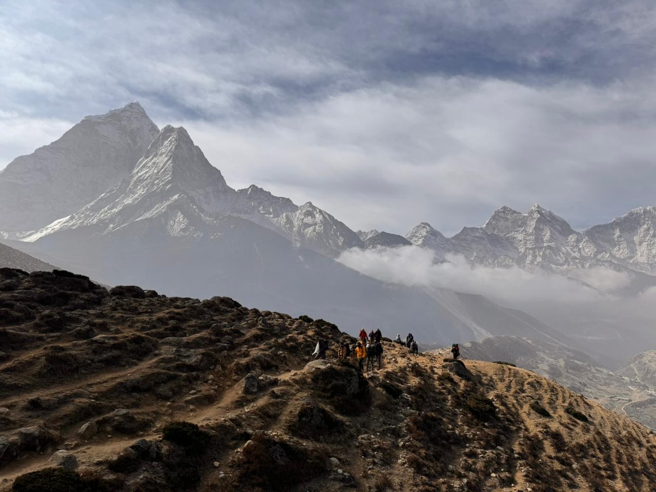 O dia esteve parcialmente nublado, ainda está seco, não chove, e a gente está na expectativa de que caia alguma neve para poder limpar um pouco o céu e a gente poder ter vistas um pouco mais impactantes, mas hoje já pudemos ver Taboche, Cholatse, Ama Dablam, Everest, Nuptse, Lhotshe… foi um dia bastante intenso, bacana, cheio de visual.