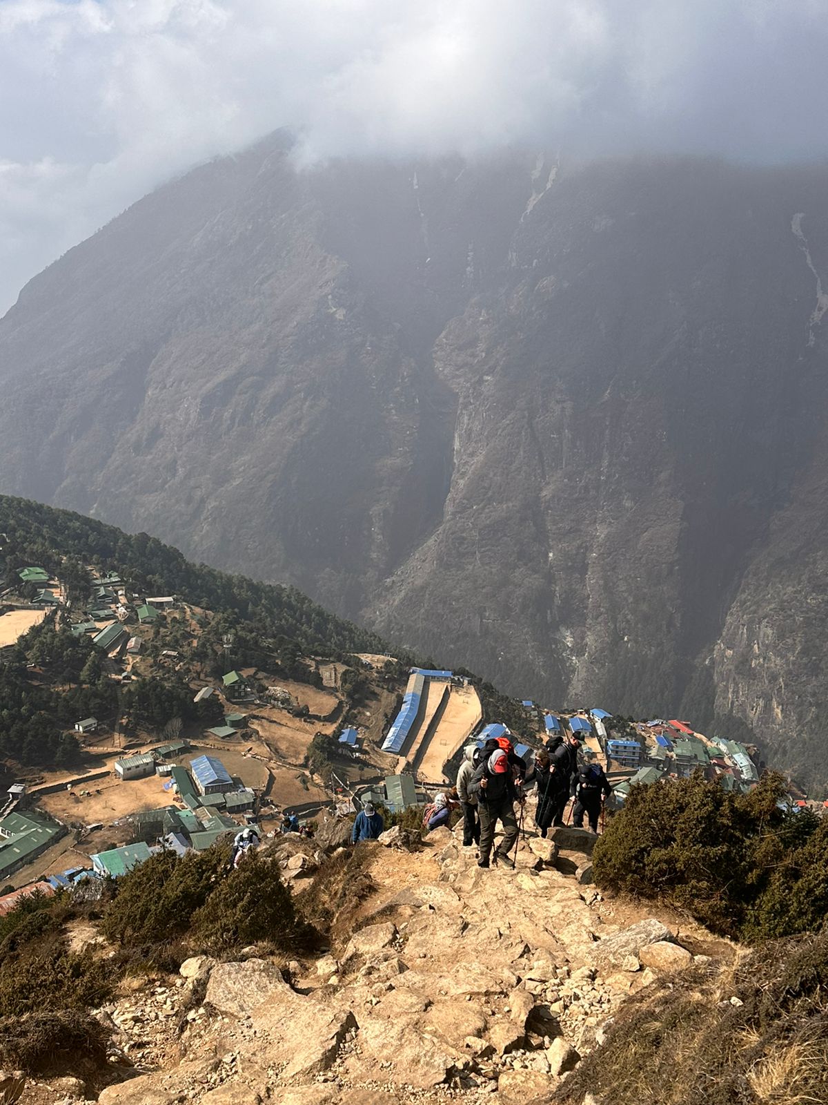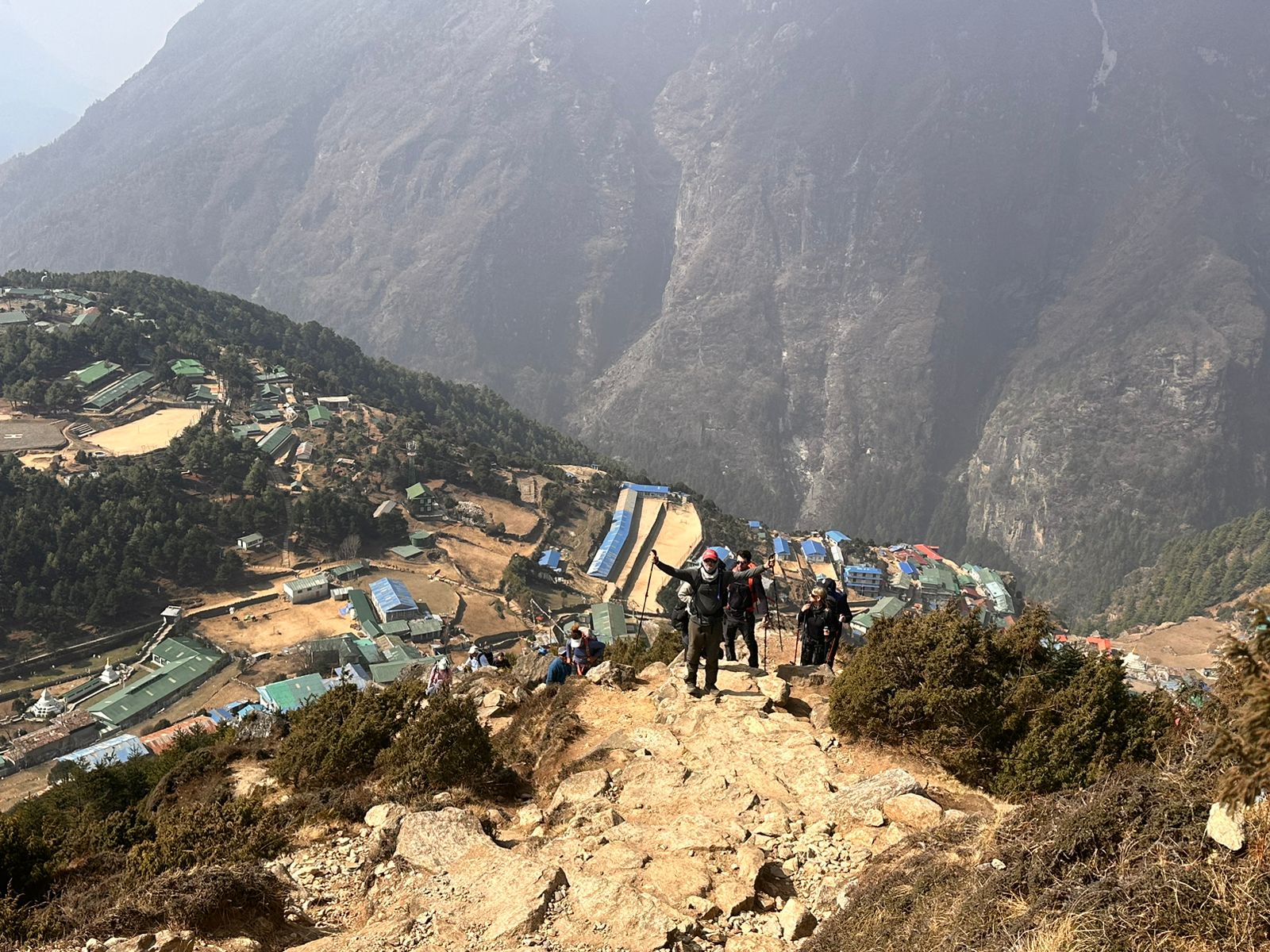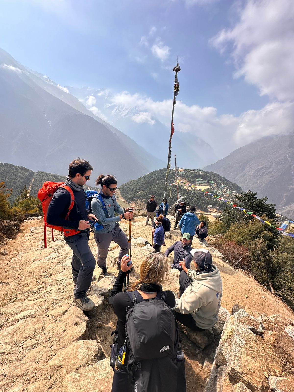 Chegamos no Everest View (3.880 m) às 10h25. A caminhada foi incrível, vimos muitas montanhas enormes, de 6 a 7 mil metros no entorno. O primeiro trecho teve bastante subida por escadas e no trecho final mais plano com leve inclinação.